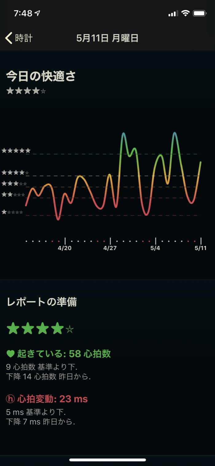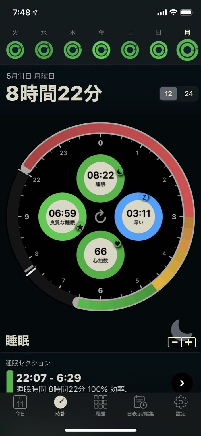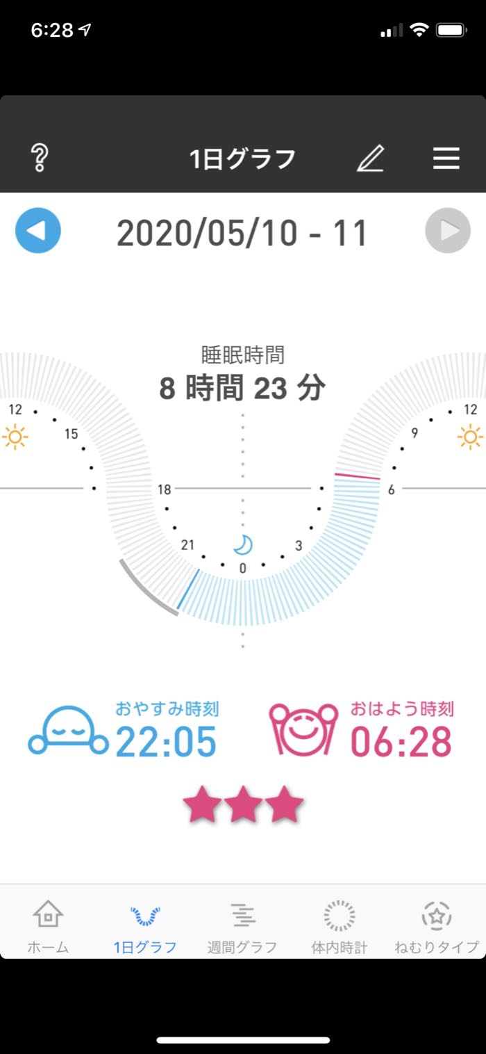 ▲ 早寝して中途覚醒もなく深くぐっすり眠れた。