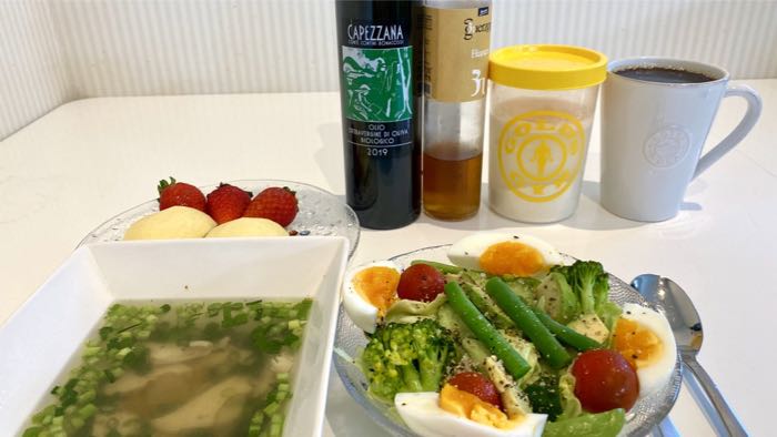 ▲ ボディメイクサラダ、鶏胸肉スープ、フルーツ、なみなみコーヒー、プロテイン。