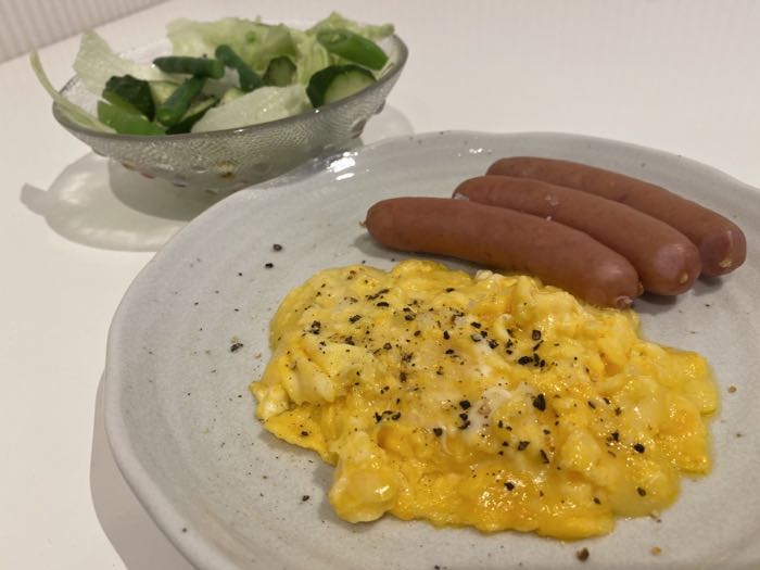 ▲ チーズスクランブルエッグ、ソーセージ、サラダ。