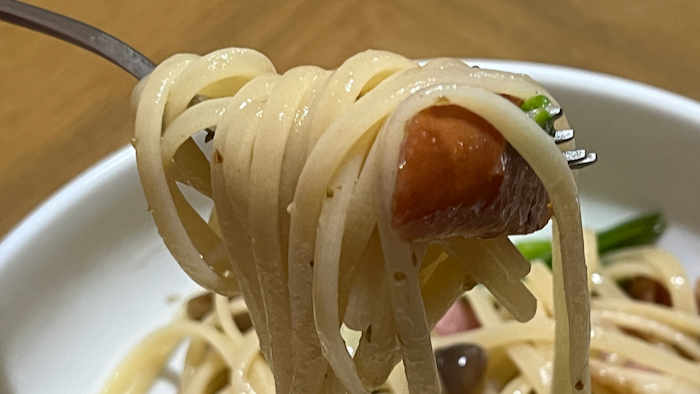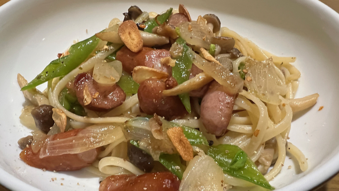 ▲ 昼ごはんにソーセージとシメジのペペロンチーノパスタを作る。