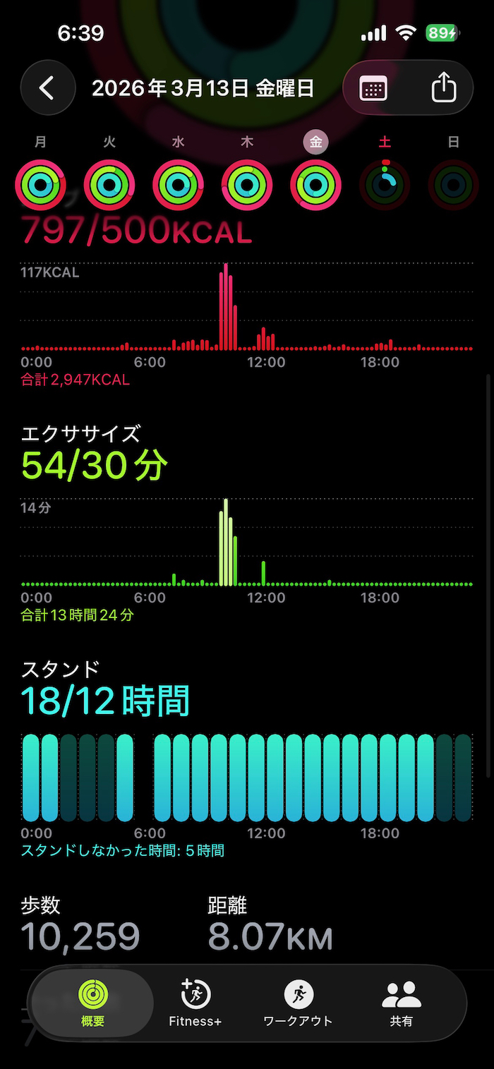 Apple Watchのアクティビティのゴール達成だけを目指すと1日6,500〜7,000歩で終わるが、やはり1万歩くらい歩くと睡眠の質が良くなる気がする。