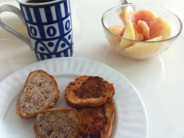 △ Pan Rizottaのパンと明太子ラスク。フルーツは桃、コーヒー。