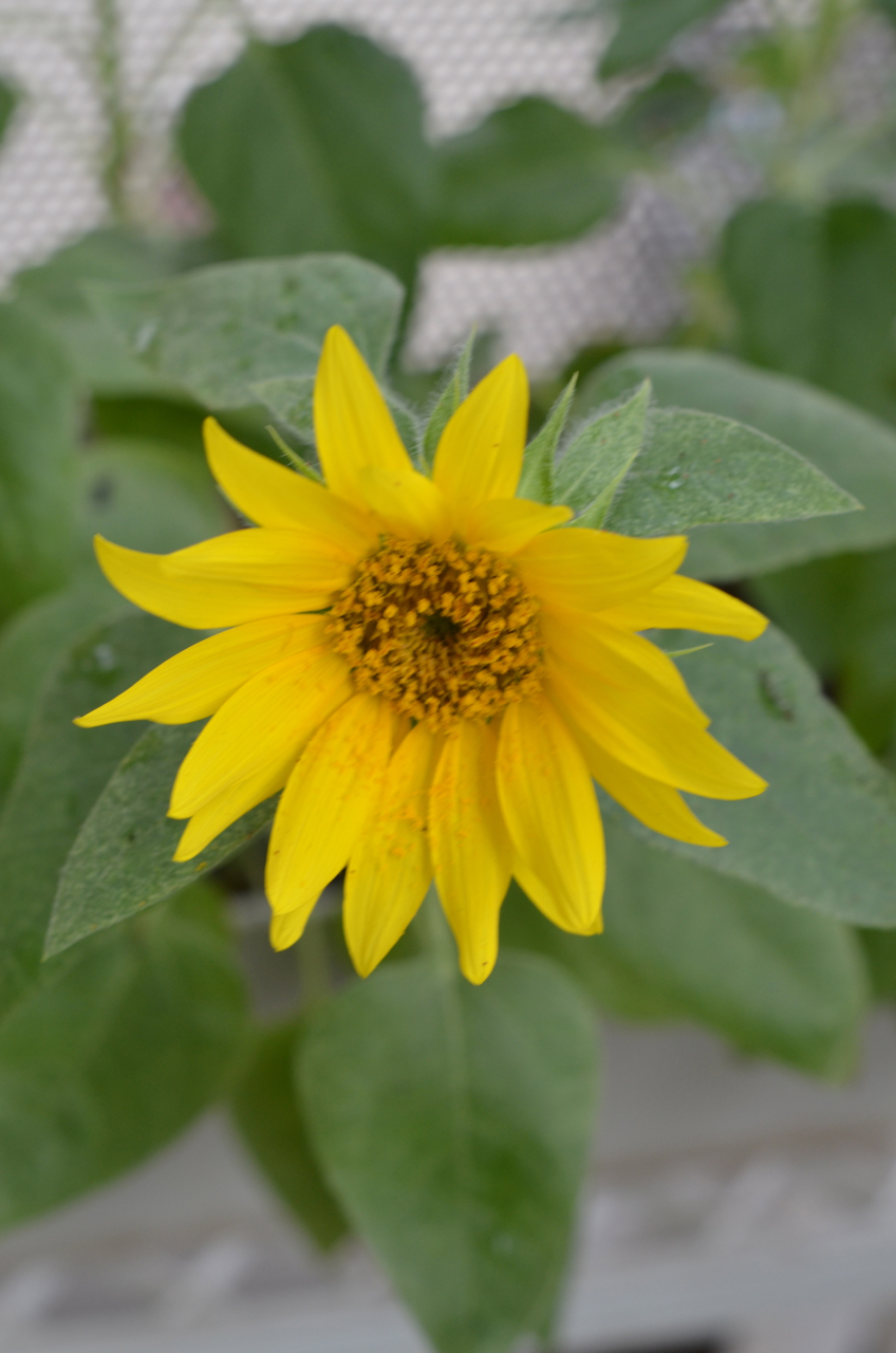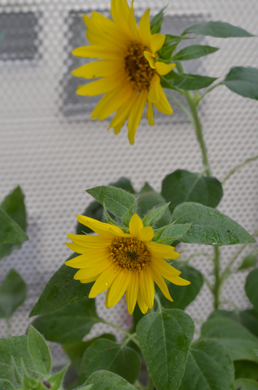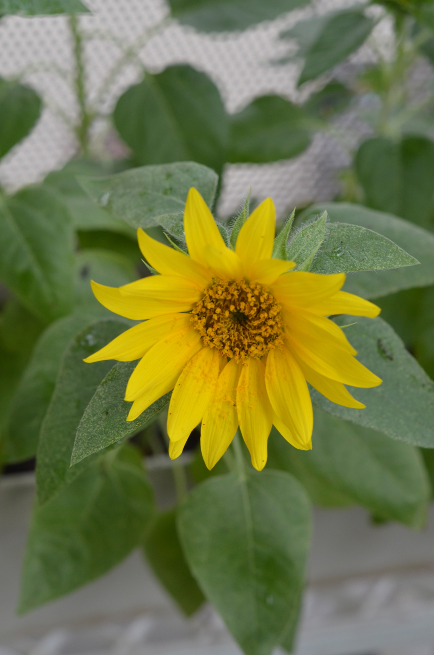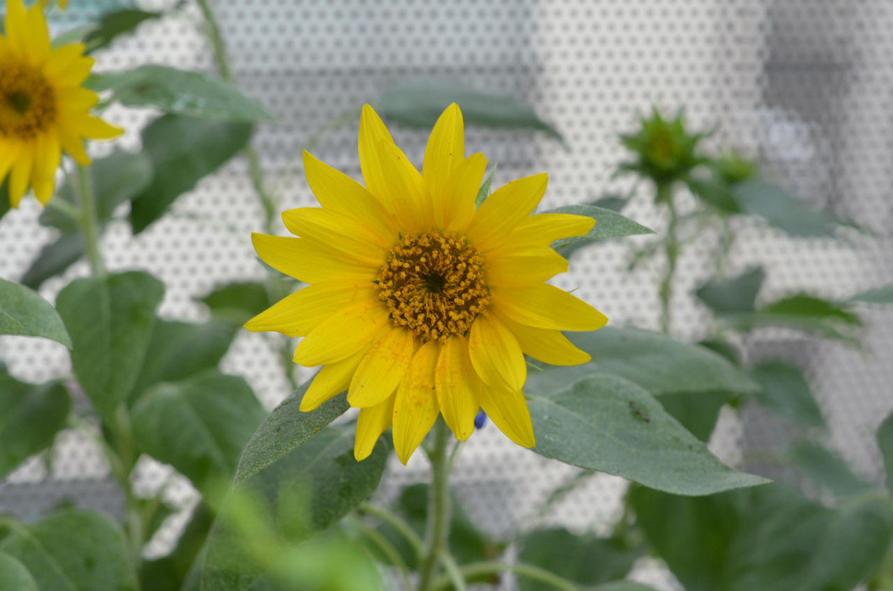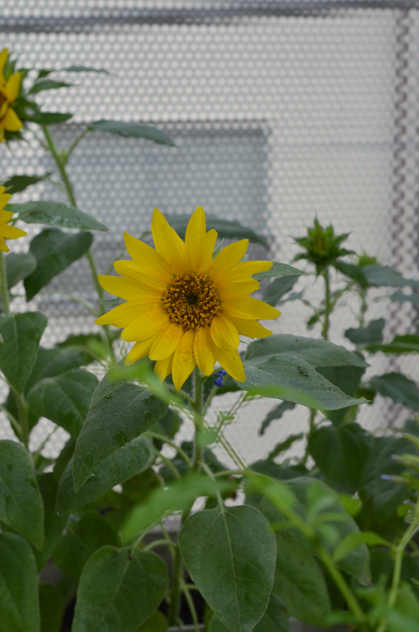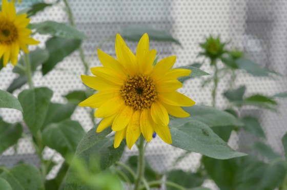 △ こんなに小さいヒマワリでも、種が採れるかな?奥さんは「ダメじゃないの?」とのこと。
