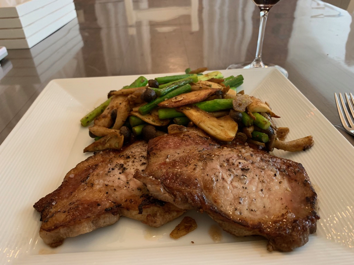 ポークソテーとどっさり焼き野菜での夕食。