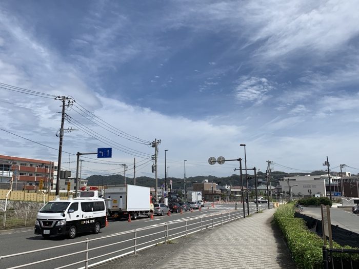 まず滑川の交差点に来たら、小坪トンネルが土砂崩れで通行止めとのことで、国道134号が逗子方面に出られなくなっていた。
