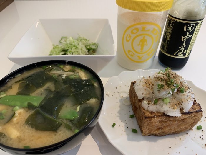 ▲ オクラ納豆、厚揚げ焼き、具だくさん御御御付け、プロテイン。