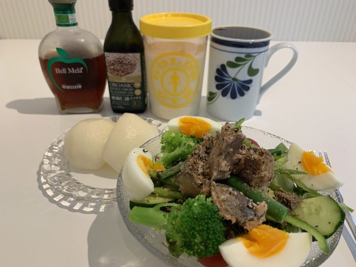 今朝はアップルビネガーと亜麻仁油の組み合わせ、トッピングはサバの水煮缶、フルーツは豊水梨。