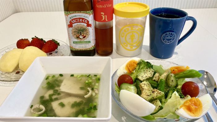 ▲ ボディメイクサラダ、鶏胸肉スープ、フルーツ、なみなみコーヒー、プロテイン。