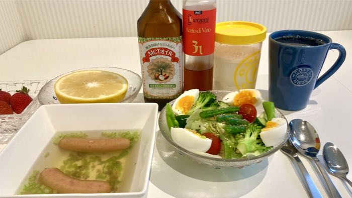 ▲ ボディメイクサラダ、鶏胸肉スープ、フルーツ、なみなみコーヒー、プロテイン。