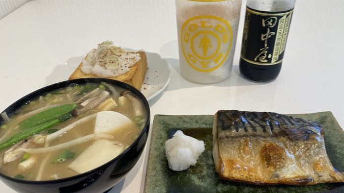 ▲ サバの一夜干し、厚揚げ焼き大根おろし、御御御付け、プロテイン。