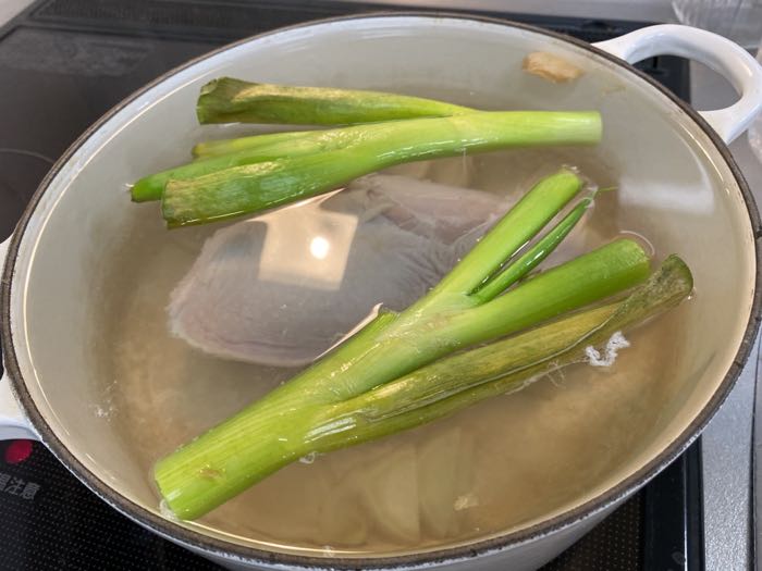 ▲ 夜は明日からの鶏胸肉スープを仕込む。
