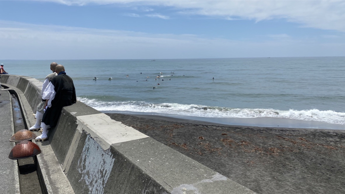 ▲ 七里ガ浜にお坊さんが並んで座っていて似合っていた。