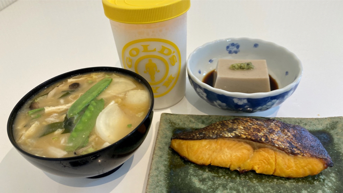 ▲ 鮭の西京焼き、ごま豆腐、御御御付け、プロテイン。