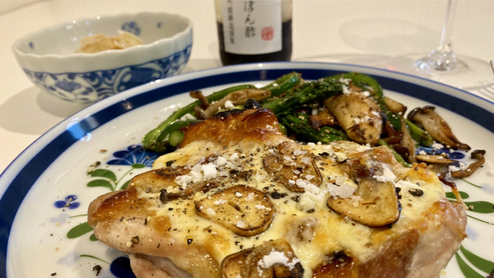 ▲ チキンのチーズグリル、おろしポン酢、焼き野菜キノコ。