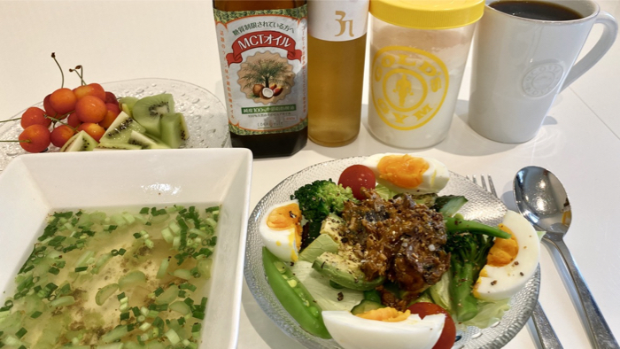 ボディメイクサラダ、鶏胸肉スープ、フルーツ、プロテイン、なみなみコーヒー。