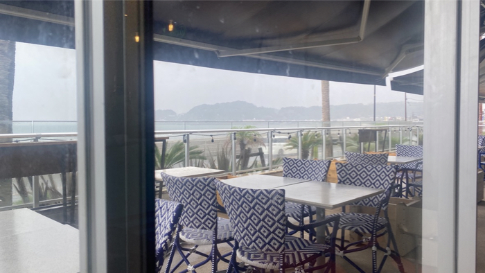 テラス席は寒そうだったので店内で海と雨を眺めながらのランチ。