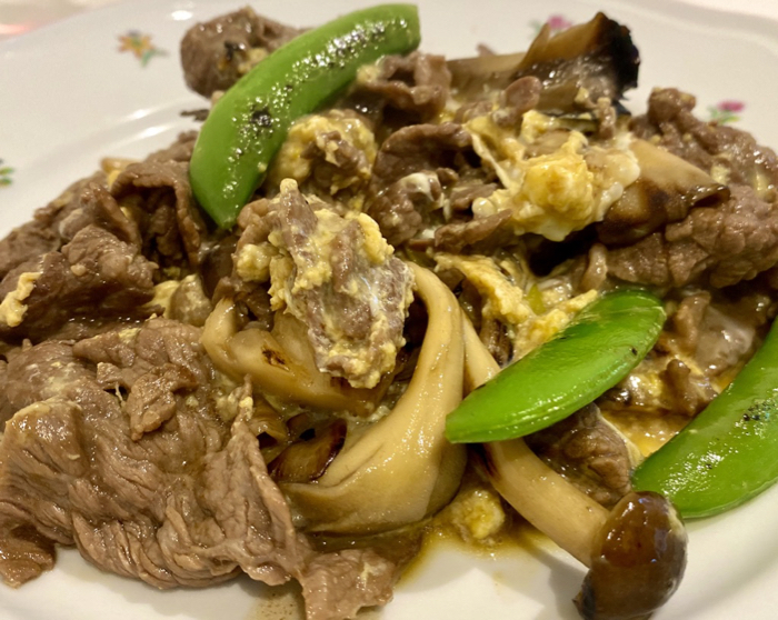 ▲ 牛肉と舞茸、シメジのたまご炒め。