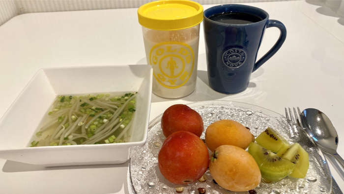 ▲ 鶏胸肉スープ、フルーツ、プロテイン、なみなみコーヒー。