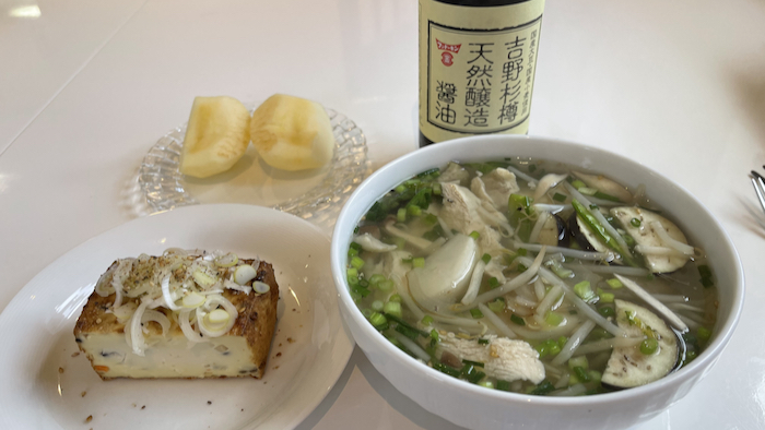 ▲ 昼ご飯。鶏胸肉スープ、五目厚揚げ焼き、シナノスイート。