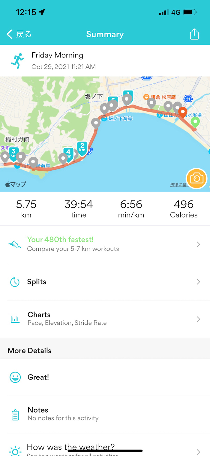 ▲ 最後Runkeeperが一瞬落ちていたようで、250メートル足りていないが実際は6kmラン。