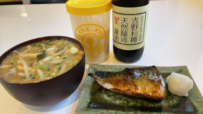 ▲ 昼ご飯。鯖の一夜干し、具だくさんの豚汁、プロテイン。