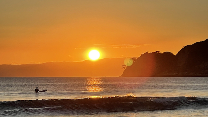 ▲ 夕暮れ時に波に乗るサーファーたち。