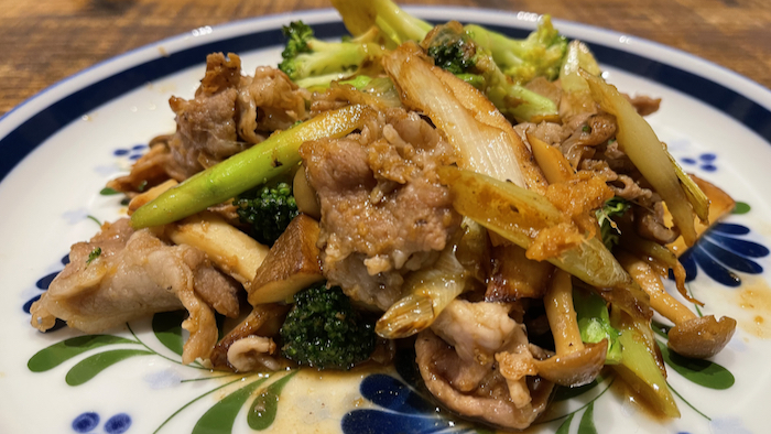晩御飯は豚の生姜焼き。アスパラとネギ、ブロッコリーを入れてみた。
