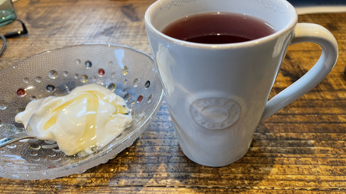 ▲ 今朝もMCTオイルとギリシャヨーグルト、そして今日から三日間のファスティングのためコーヒーではなくハーブティー。
