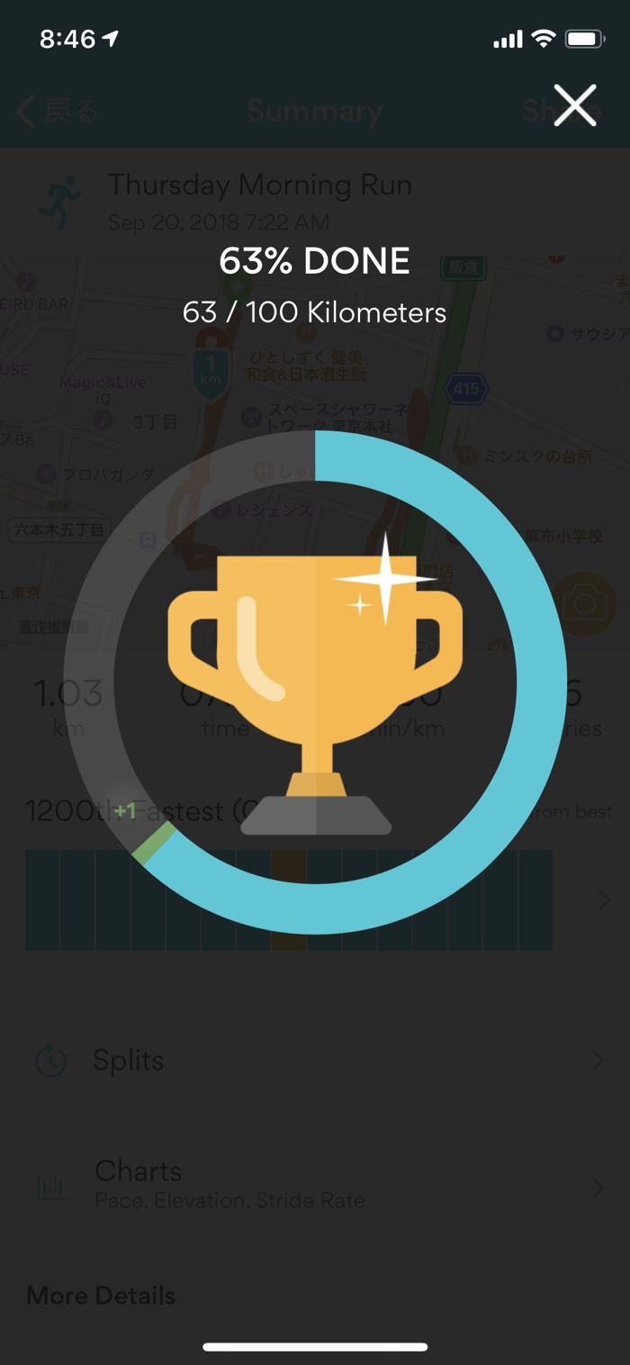 ▲ 今月の目標100kmまであと38km(画面表示は1km多く誤差が出ている)。
