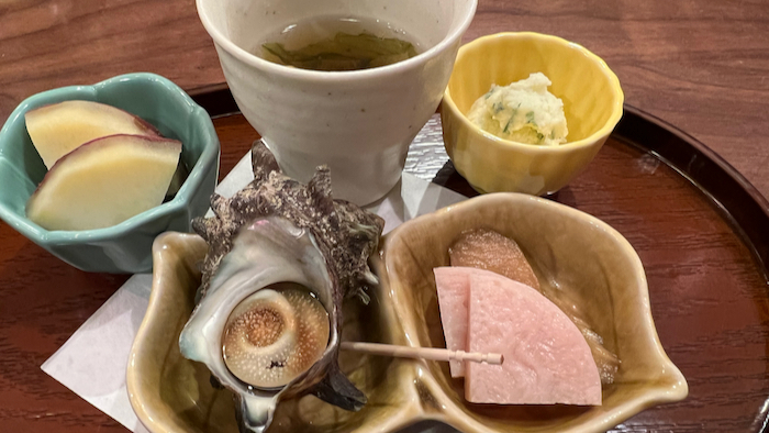 ▲ お通しがオシャレで豪華で驚いた。