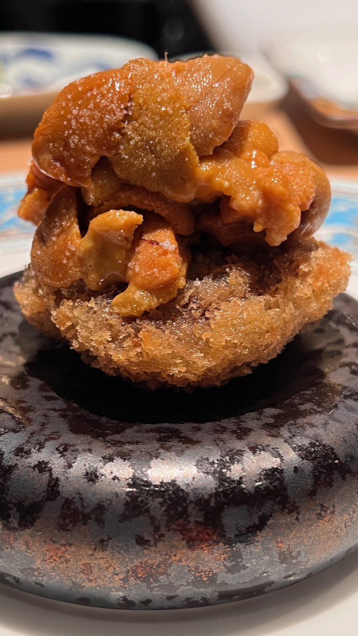 アツアツのメンチカツと冷たいウニのハーモニーが素晴らしい。
