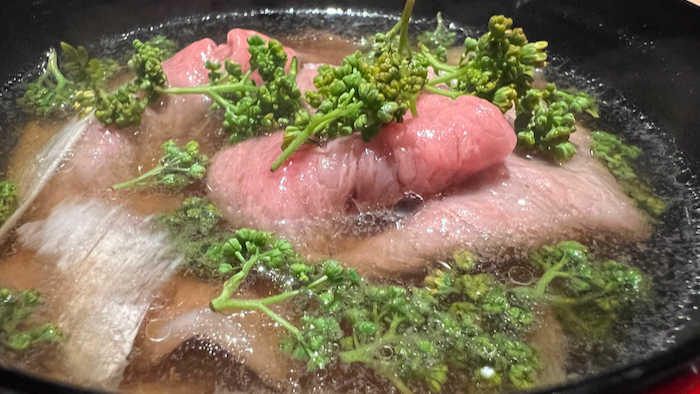 ▲ 4月のしゃぶしゃぶは季節物の花山椒とホワイトアスパラガスがたっぷり。