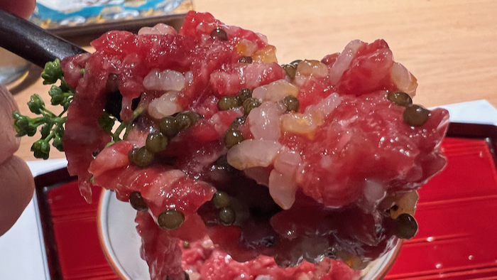 ▲ 岡田前のユッケはひき肉ではなく、包丁で丁寧に刻んだもの。