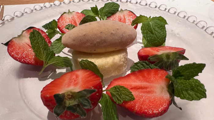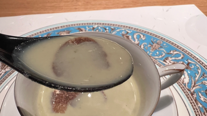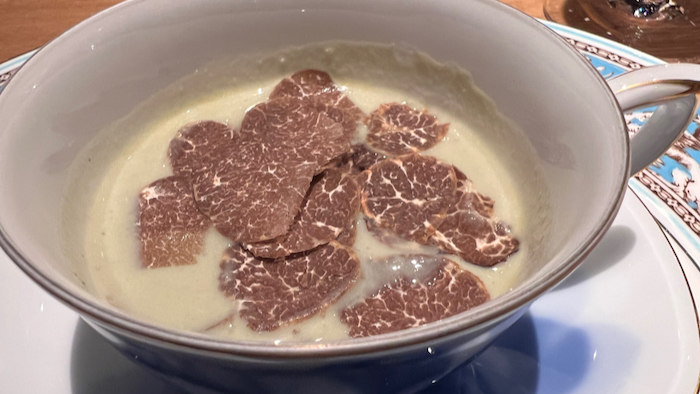 まずは空豆のポタージュなのだが、いきなり黒トリュフがどっさり掛かっている。