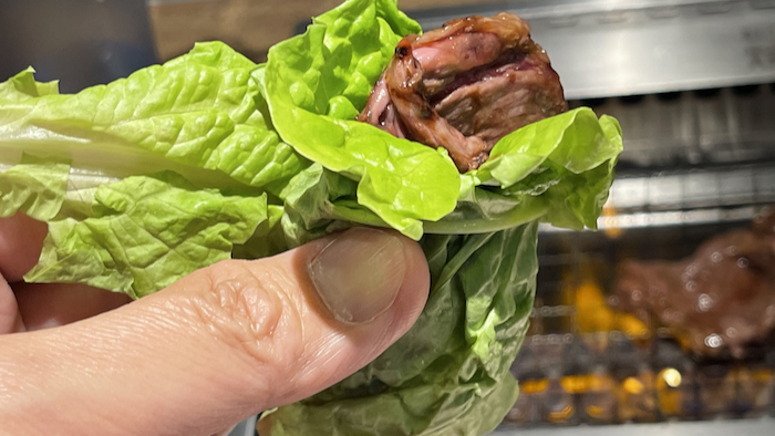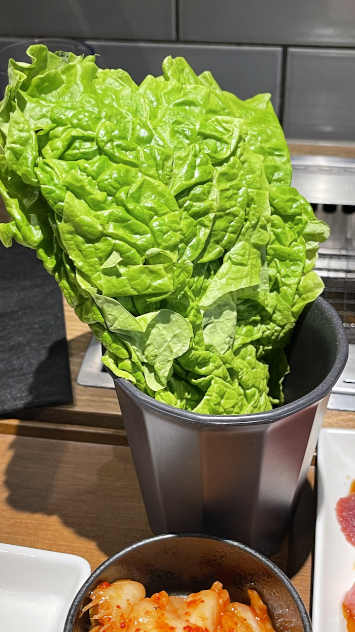 ときどき安いお店だとサニーレタスやグリーンリーフを使って「サンチュ」と呼んでいるお店もあるけど、ここのはちゃんとサンチュだった。