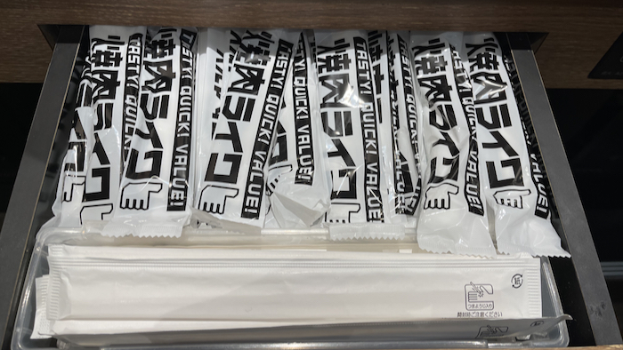 ▲ テーブルの下の引き出しにおしぼりと割りばしが入っている。