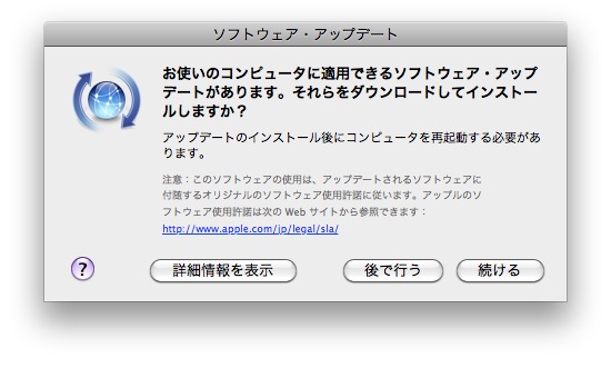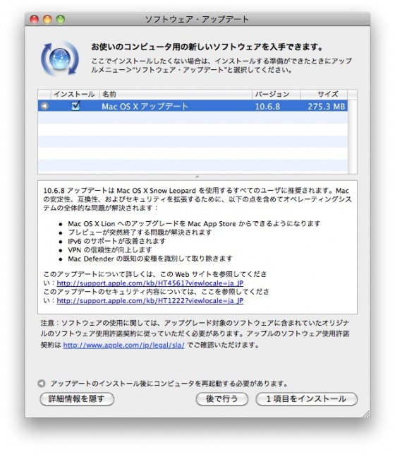 すっかり出遅れてしまったが、旅の間にMac OS X 10.6.8がリリースされたので、今朝インストール。