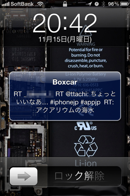 Boxcarという無料のiPhoneアプリがある。TwitterやFacebook、それにE-mailなどをiPhoneのロック画面やホーム画面にプッシュしてくれるプッシュ通知アプリである。